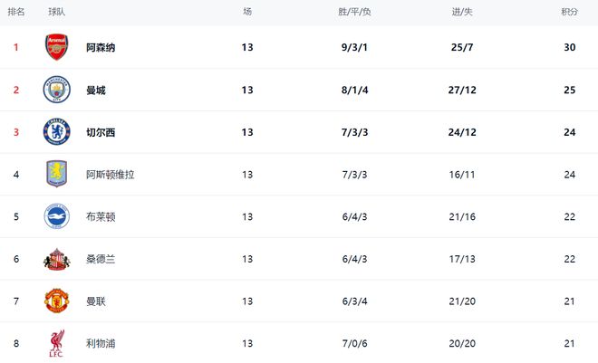 在积分榜上,丢分的阿森纳依然占据榜首位置。阿森纳9胜3平1负,拿到30分。排名第2的是曼城。曼城8胜1平4负,拿到25分,与阿森纳的差距缩小了,只有5分的差距。第3名的是切尔西,拿到24分。阿斯顿维拉状态非常出色,不断赢球,总积分也达到24分,排名第4。布莱顿和桑德兰都是22分,排名第5和第6。曼联和利物浦都是21分,排名第7和第8。热刺的成绩依然很烂,只拿到18分,排名第12。